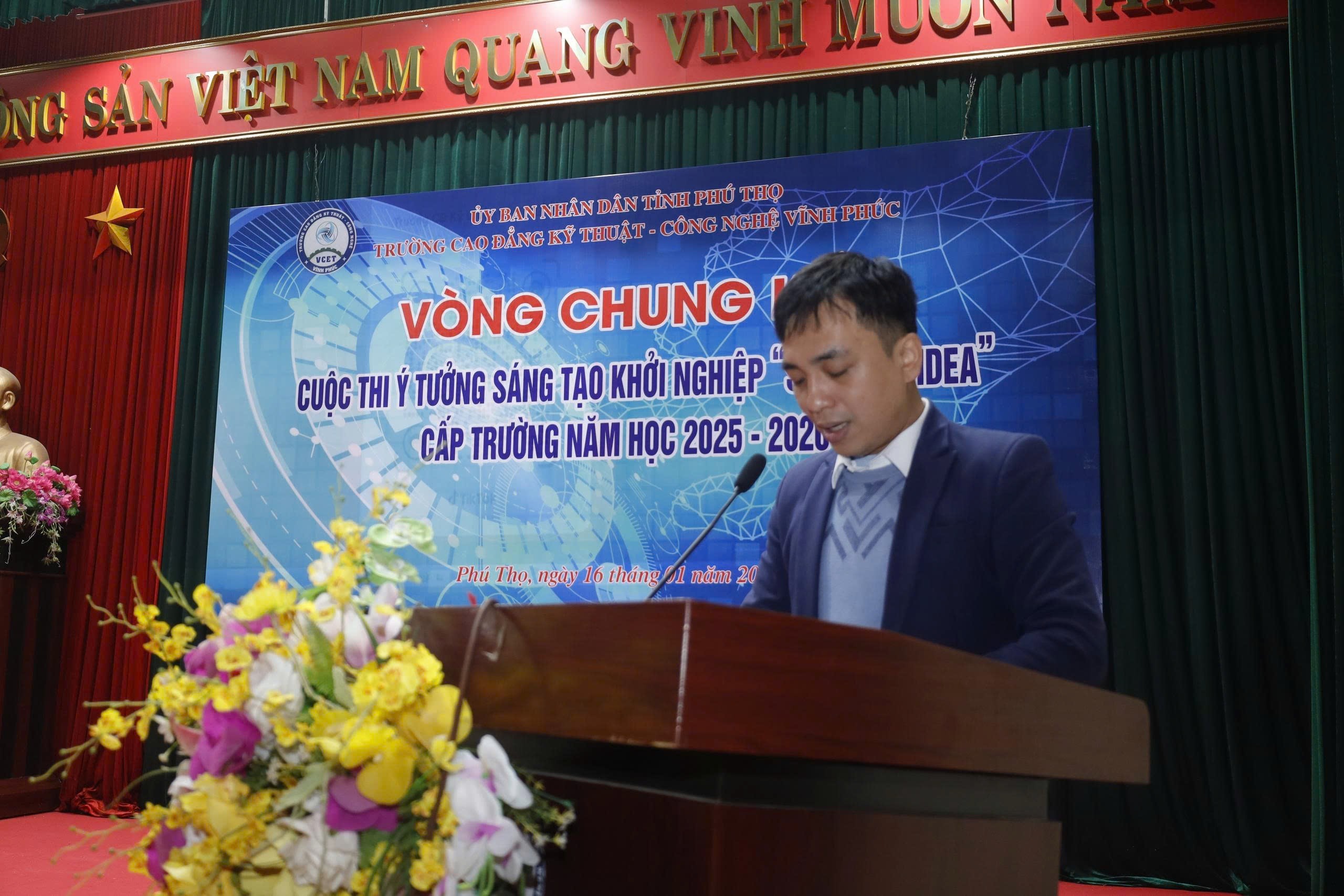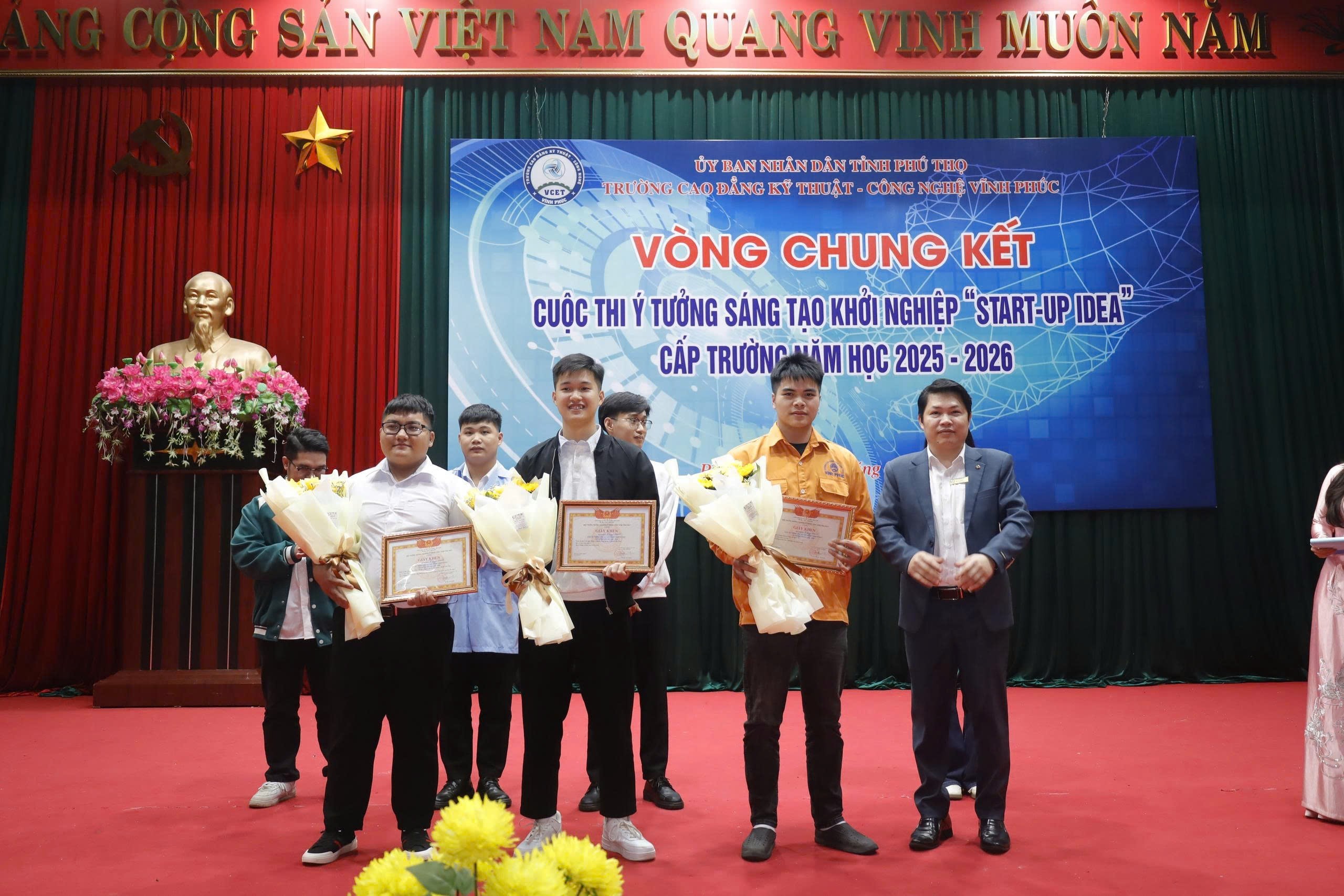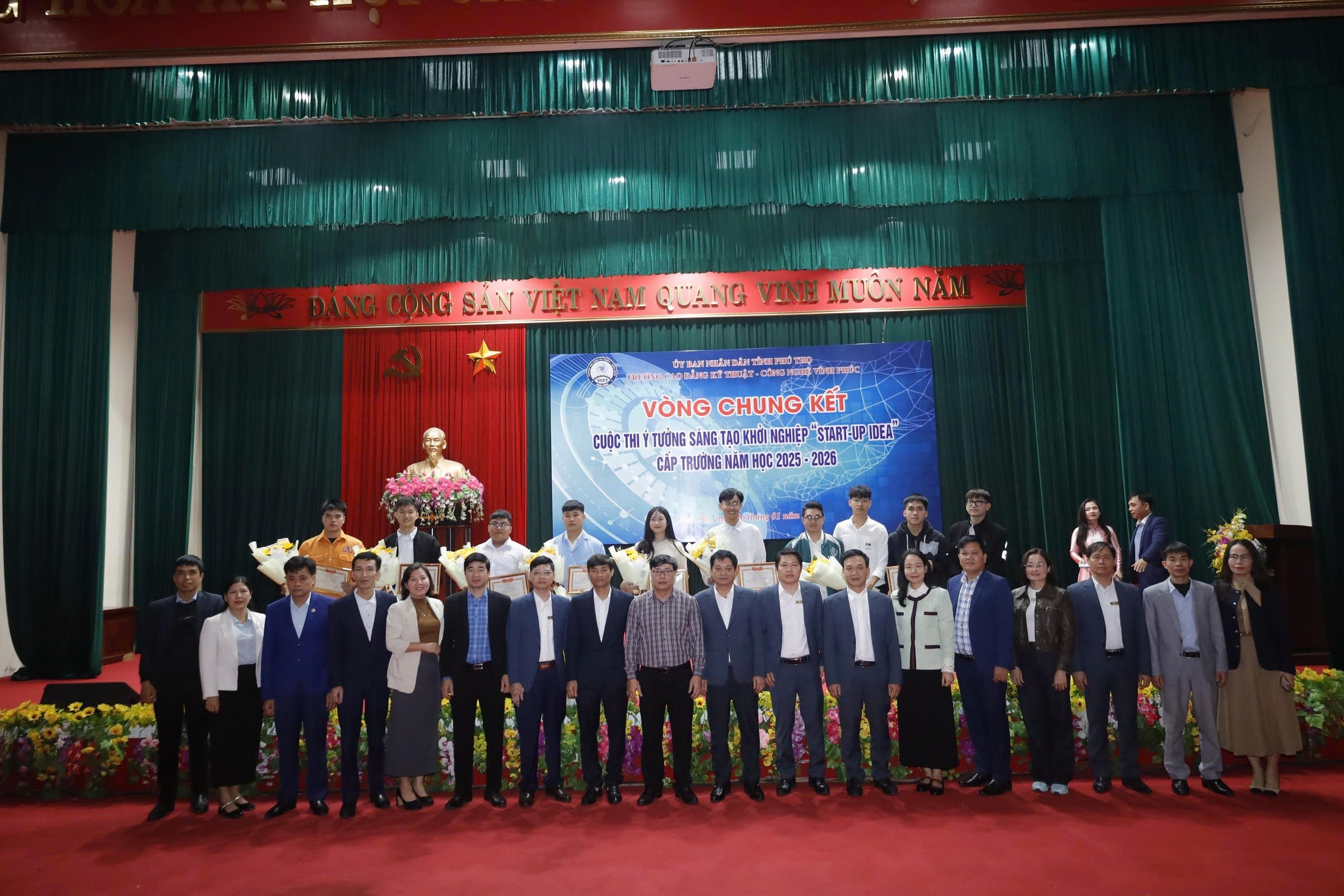 Sáng ngày 16/01/2026, tại Hội trường Trường Cao đẳng Kỹ thuật – Công nghệ Vĩnh Phúc (Cơ sở 1), Vòng Chung kết Cuộc thi Ý tưởng sáng tạo khởi nghiệp “Start-up Idea” cấp trường đã diễn ra trong không khí sôi nổi, trang trọng và đầy cảm hứng, thu hút sự quan tâm của đông đảo cán bộ, giảng viên và học sinh – sinh viên toàn trường.