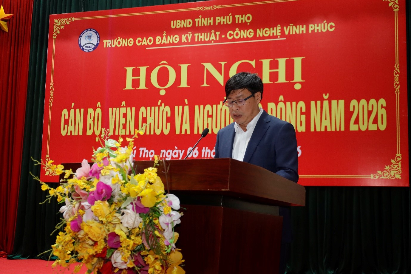 Phát biểu kết luận hội nghị, thầy giáo Hà Vũ Tuyến – Hiệu trưởng nhà trường ghi nhận và đánh giá cao tinh thần trách nhiệm, những ý kiến đóng góp tâm huyết của cán bộ, giáo viên, nhân viên; đồng thời kêu gọi toàn thể tập thể Nhà trường tiếp tục phát huy truyền thống đoàn kết, đổi mới, sáng tạo, nỗ lực phấn đấu hoàn thành tốt mọi nhiệm vụ được giao, góp phần xây dựng Trường Cao đẳng Kỹ thuật – Công nghệ Vĩnh Phúc ngày càng phát triển vững mạnh trong năm 2026 và những năm tiếp theo.
